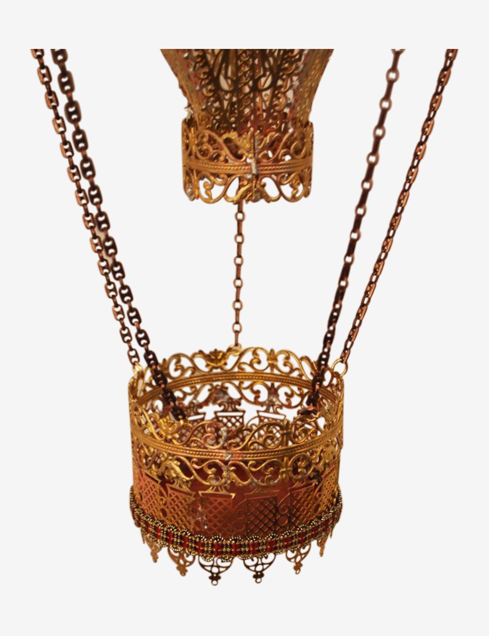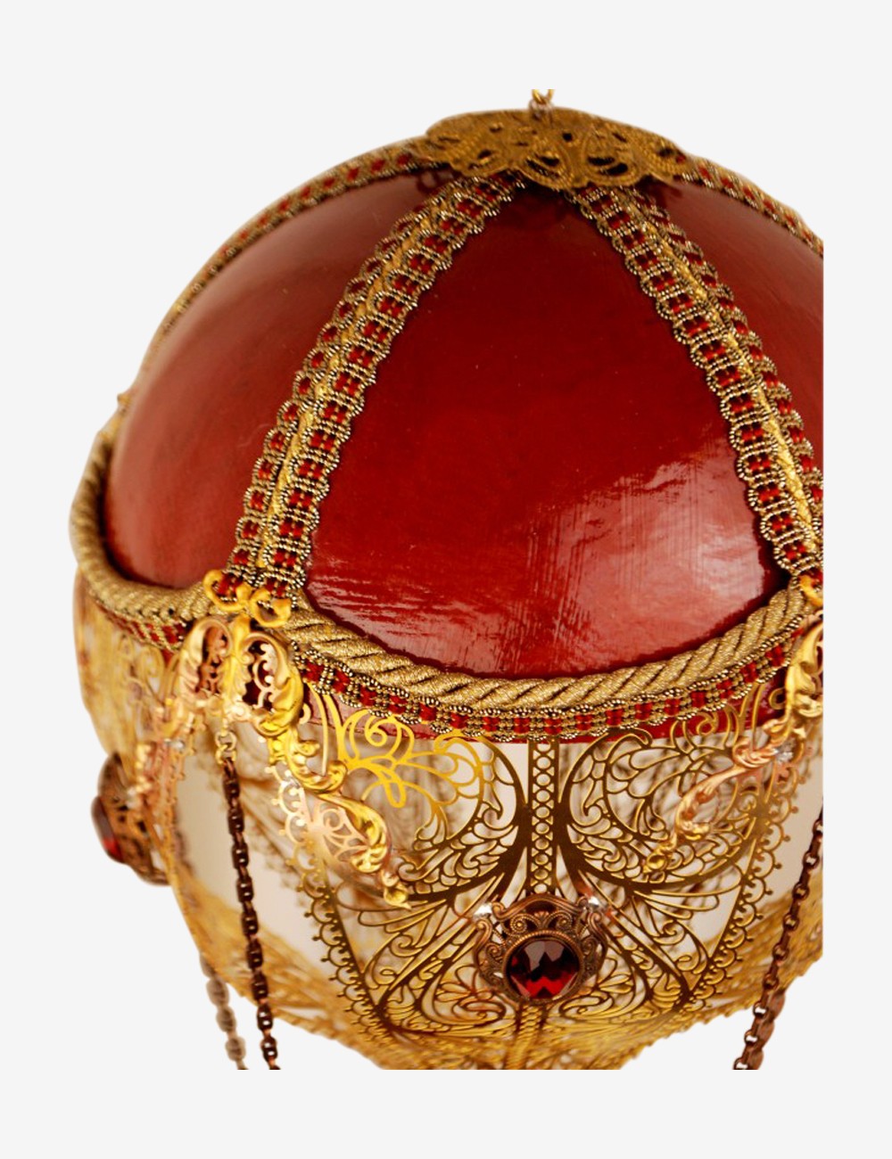 Die Pappmaché-Basis ist mit Blattgold, Verzierungen, metallischem Filigran und goldenen galvanischen Ketten verziert.