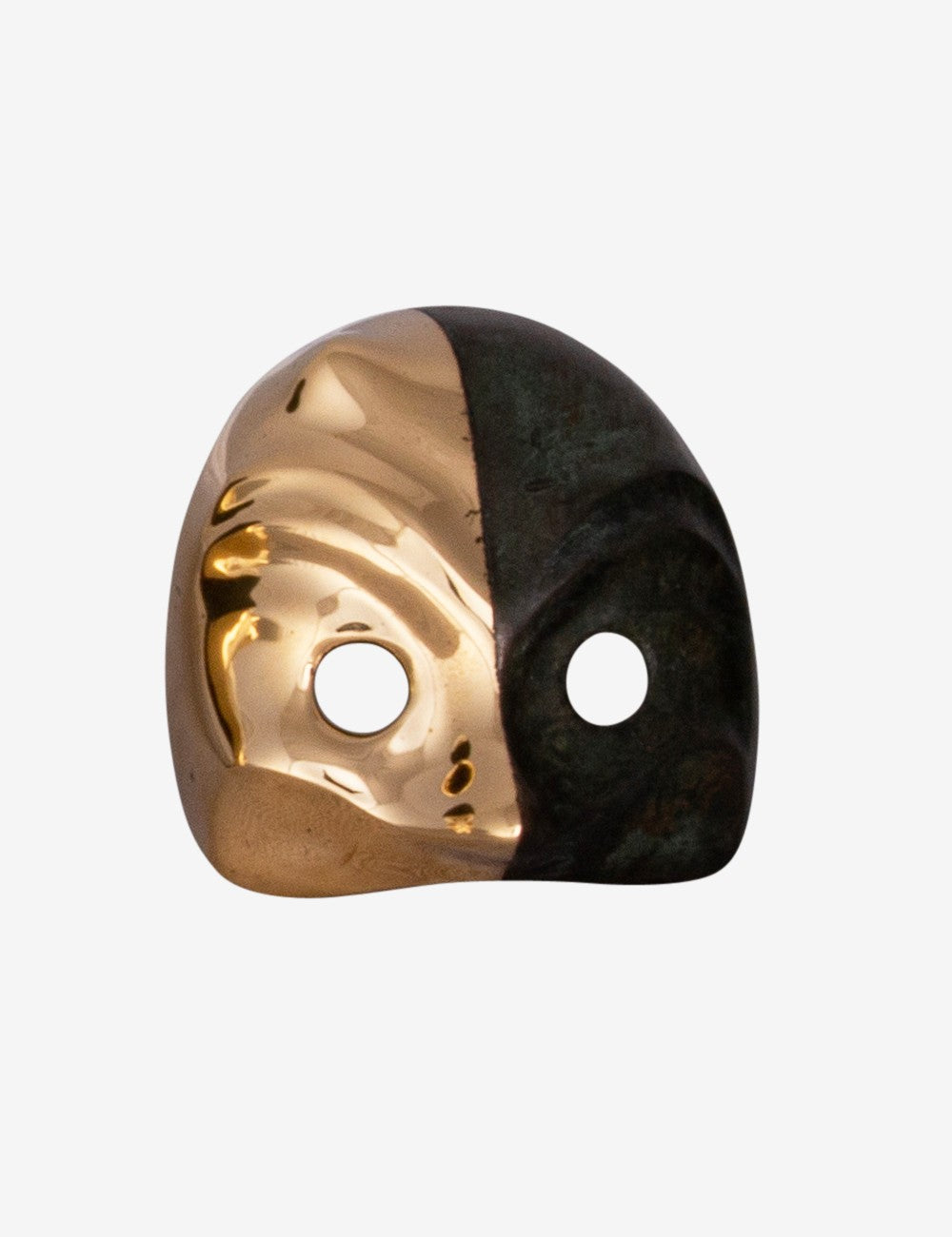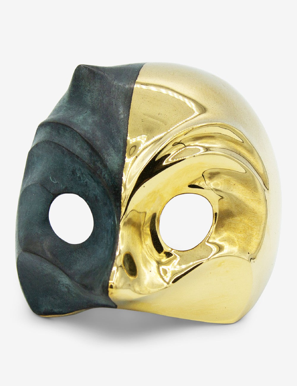 Harlekin aus Messing 2: Maske aus gegossener Bronze, komplett in Handarbeit hergestellt, mit der „Formkasten“-Technik und danach von qualifizierten venezianischen Handwerksmeistern in Handarbeit poliert und patiniert.
