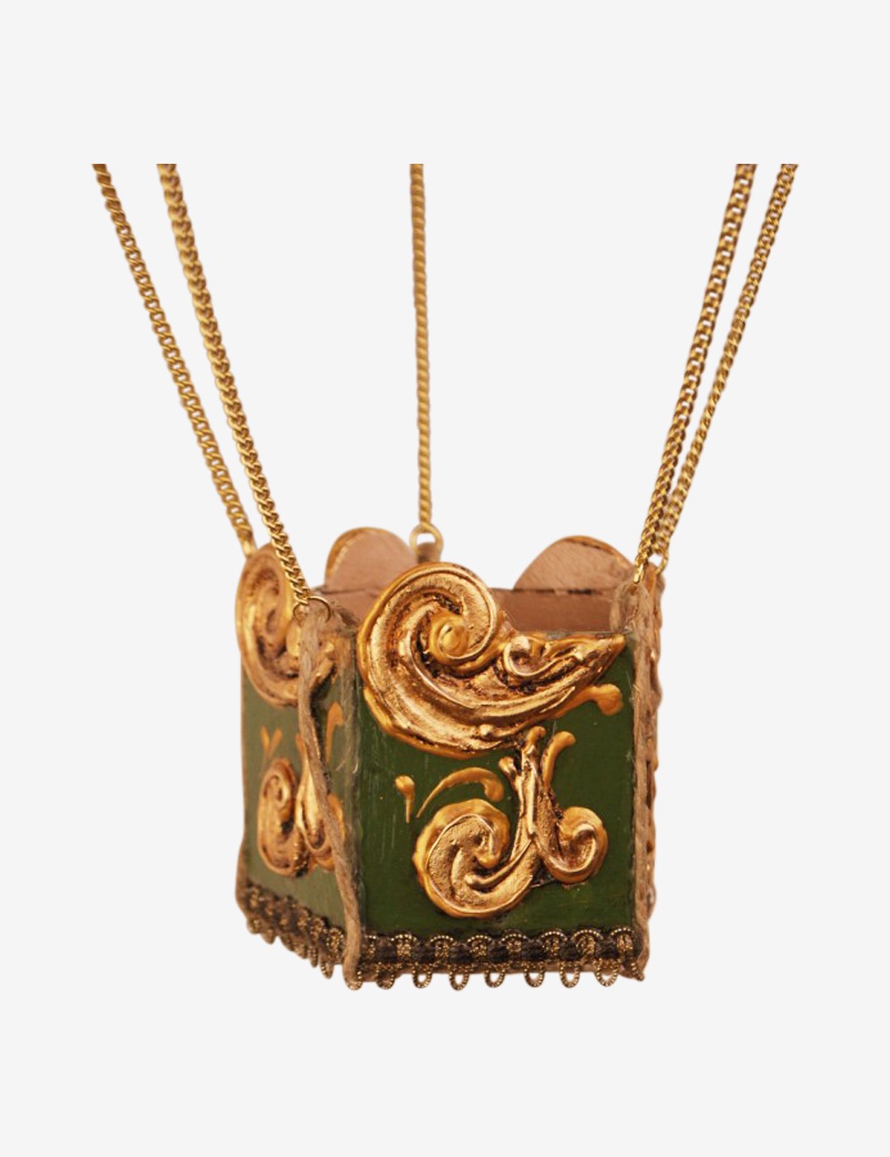 The papier-mâché base is decorated with gold leaf, trimmings, metal filigree and gold-plated chains.