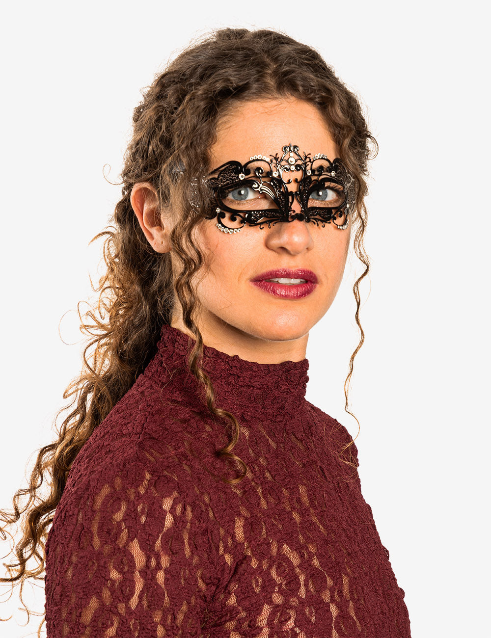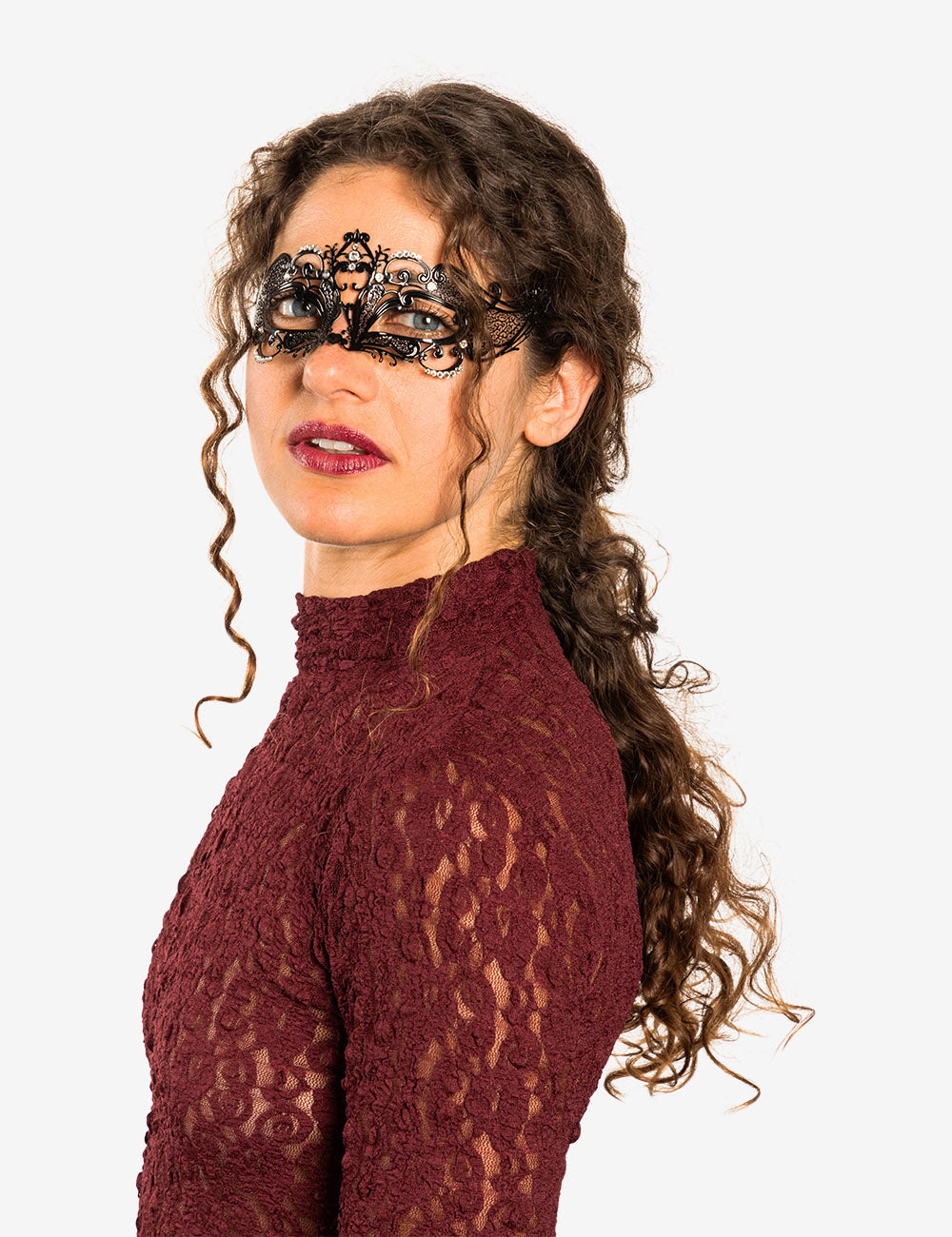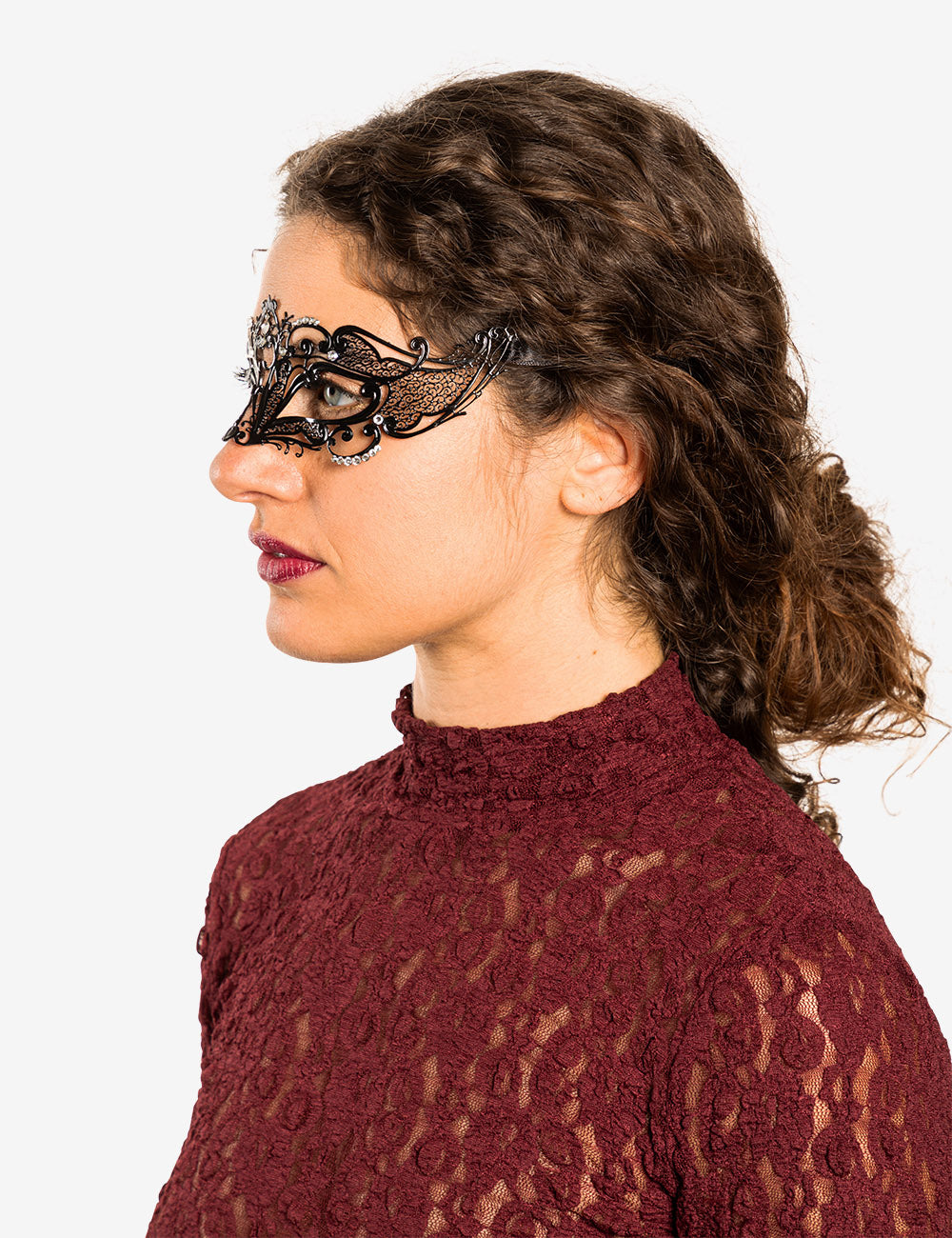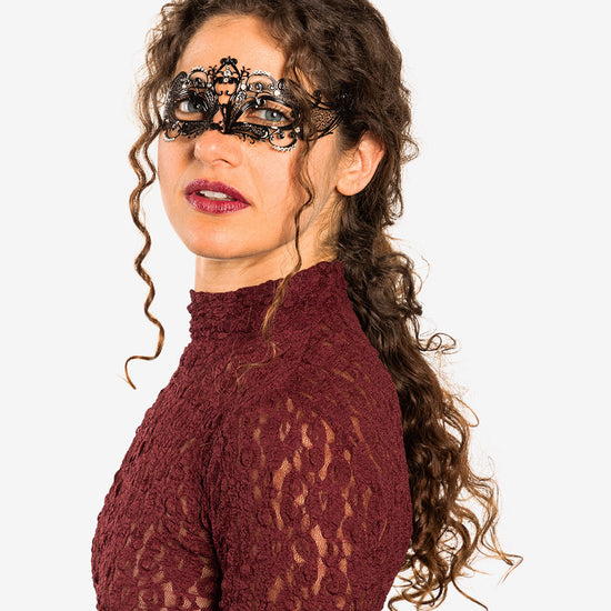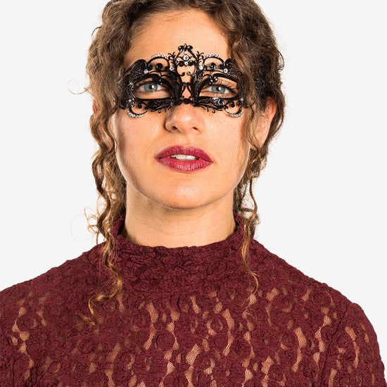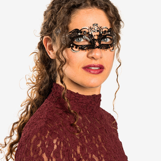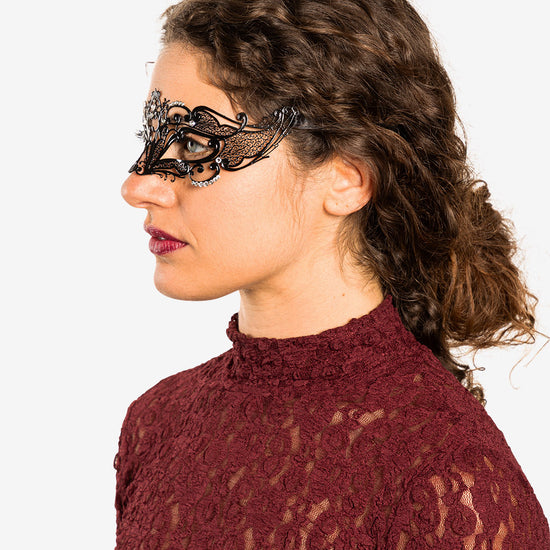 Folies authentic venetian mask with the finest metal filigree, decorated with high quality certified crystals and completed with thin satin ribbons ready to wear. Manifactured in Venice by the famous venetian masters.