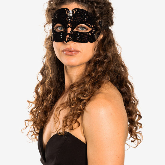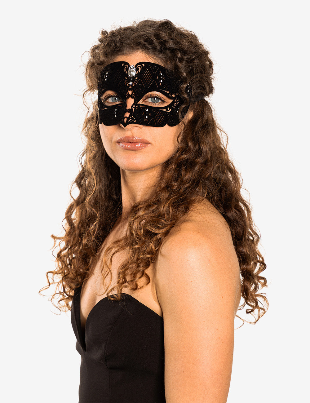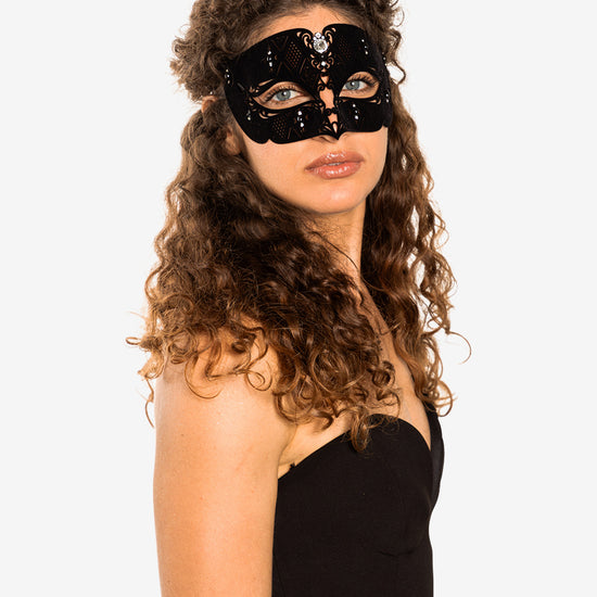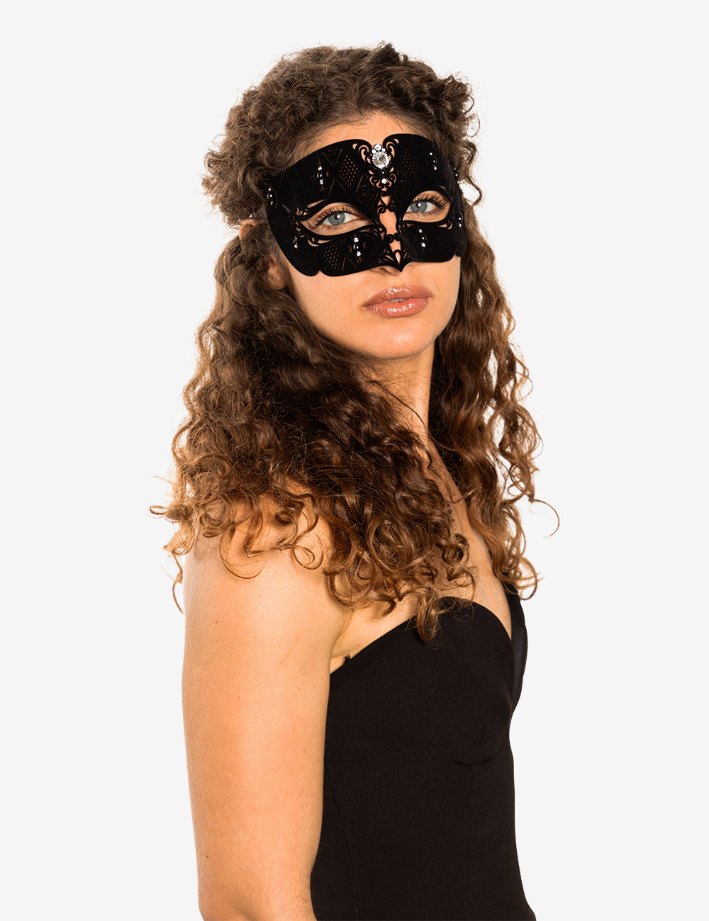Velvet Clark: Venetian mask with the finest metal filigree, carved from iron and brass and painted with water-resistant black enamel for a comfortable fit.