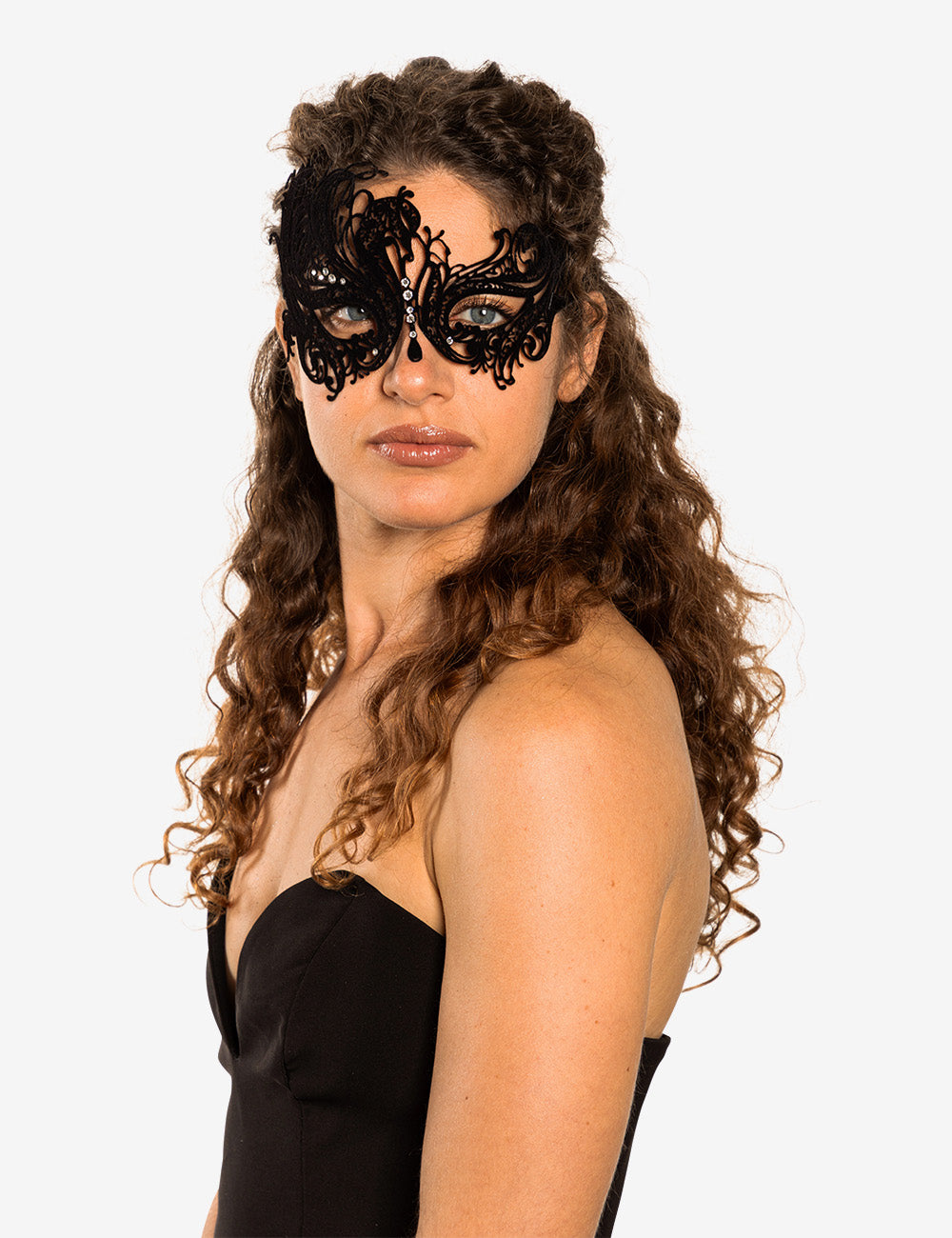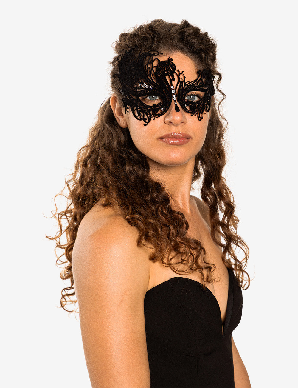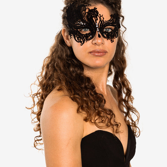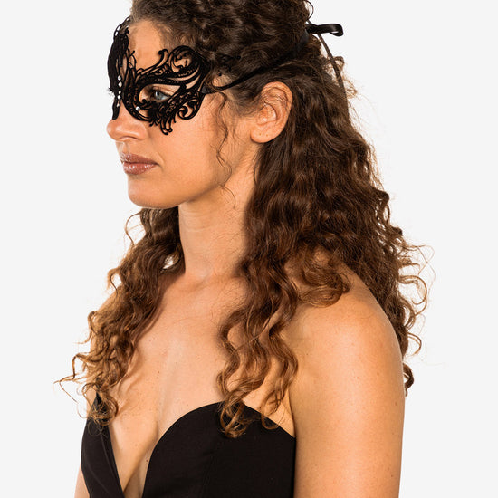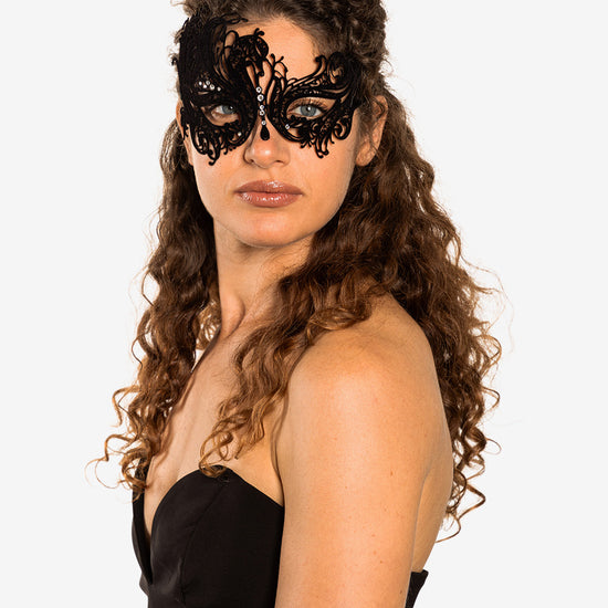 Velvet Dulcinea: Venetian mask with the finest metal filigree, carved from iron and brass and painted with water-resistant black enamel for a comfortable fit.