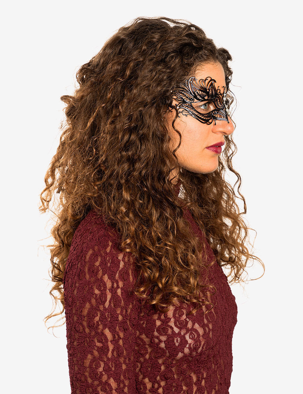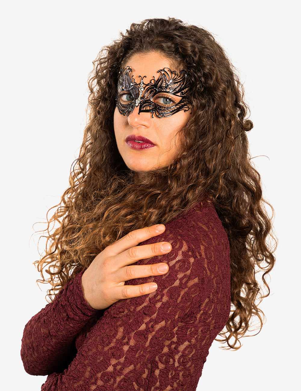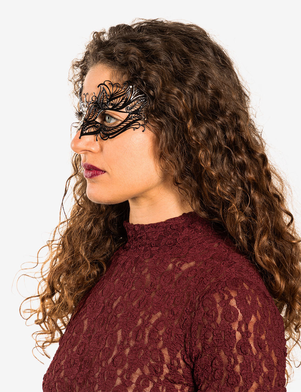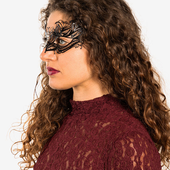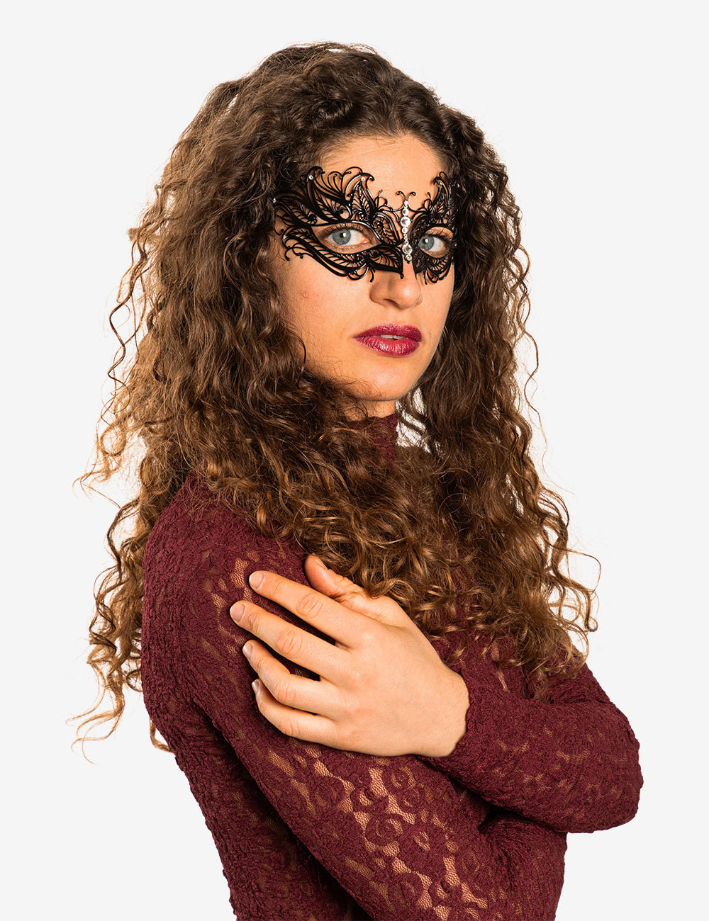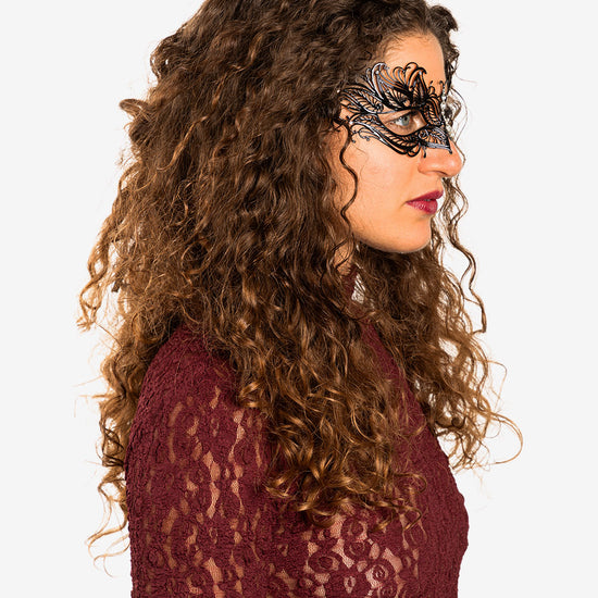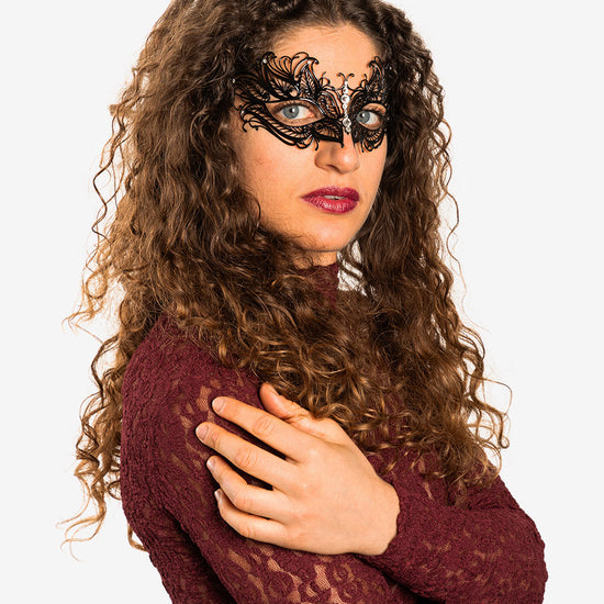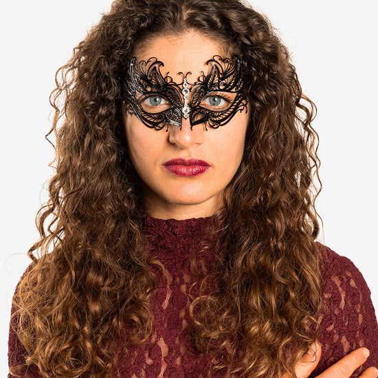 Calpurnia masque vénitien authentique en métal filigrané, cristaux certifiés de haute qualité et équipés de fins rubans de satin sur chaque cotés, prêt pur être portés.