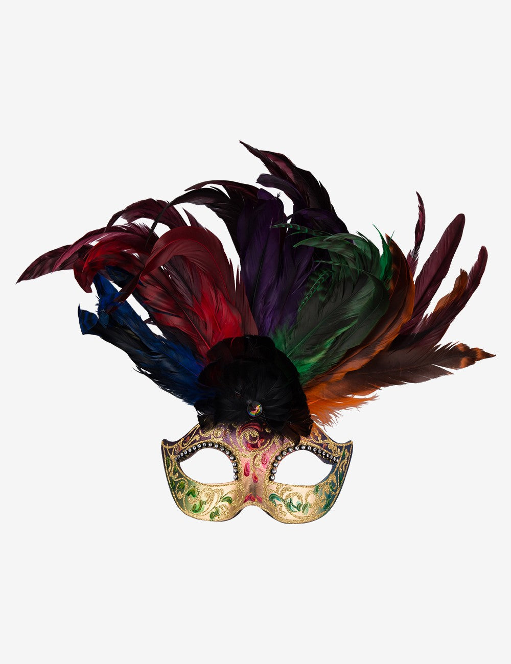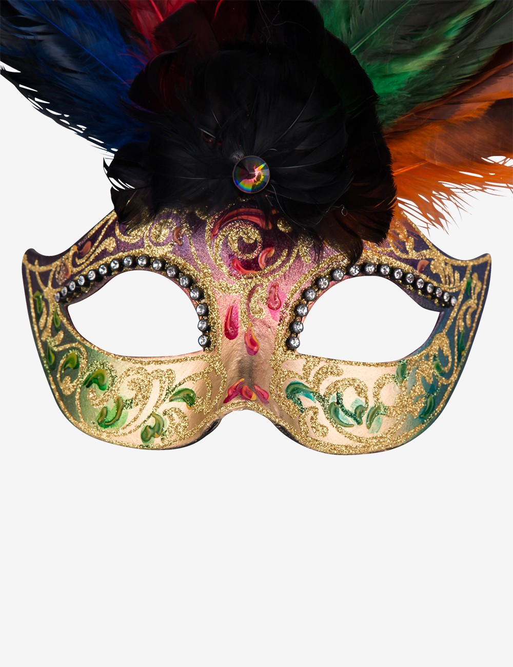 Musidora - maschera veneziana in cartapesta e piume. Realizzata a mano a venezia dai maestri artigiani. Lavorata e decorata a mano secondo la tradizione secolare del carnevale veneziano. Un prodotto tipico, originale e autentico della città di Venezia. Indossabile con lacci in doppio raso.