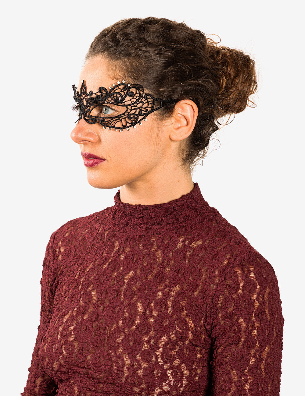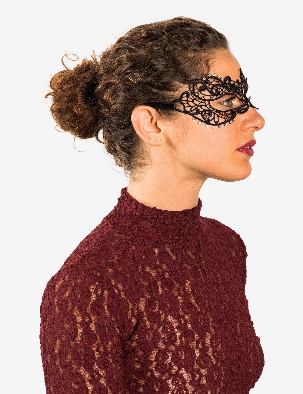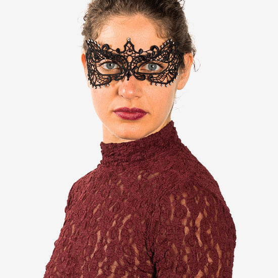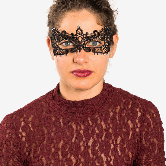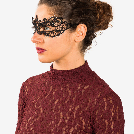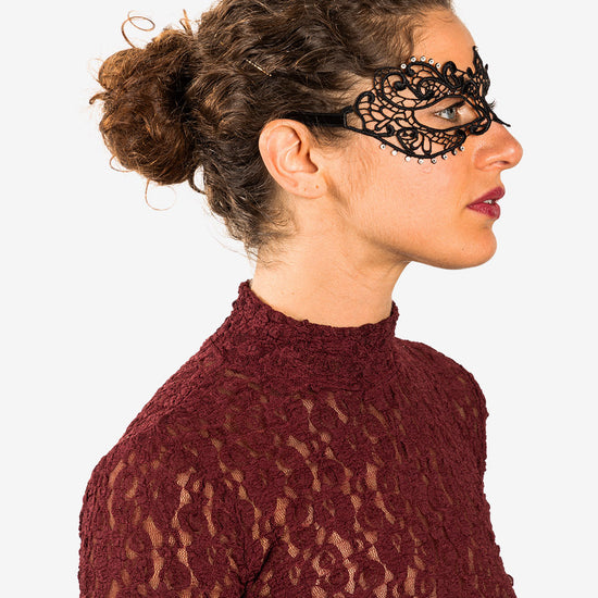 Anastasia con strass maschera veneziana in macramé realizzata a mano a venezia dai maestri artigiani.