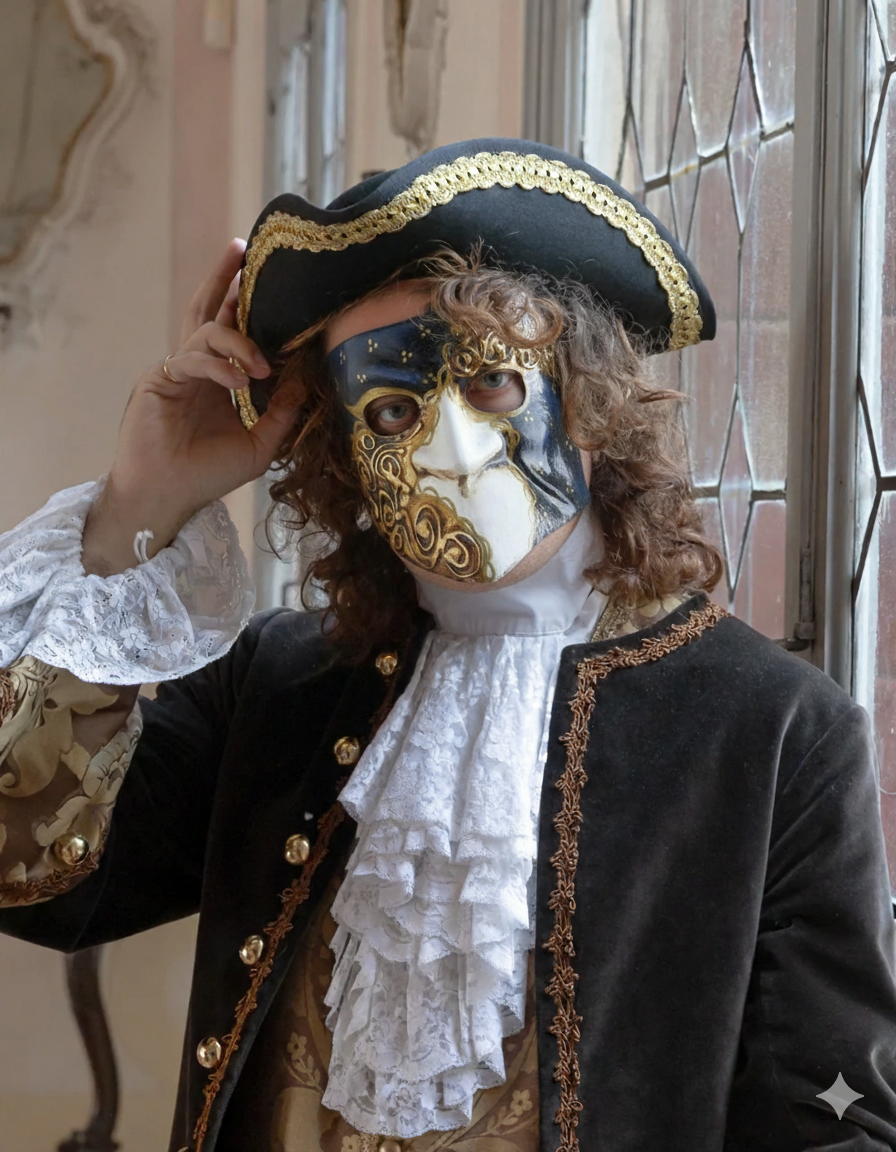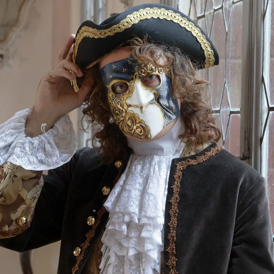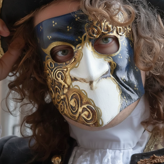 Autentica maschera veneziana di cartapesta in stile barocco. Rigorosamente prodotta a Venezia dai maestri della città secondo la tradizione del carnevale.