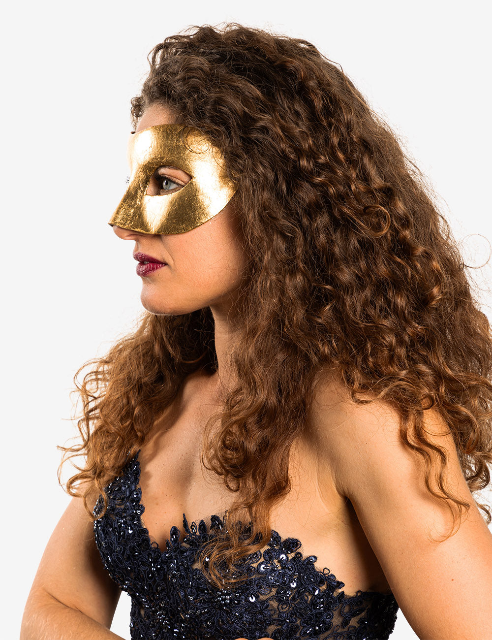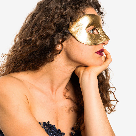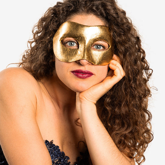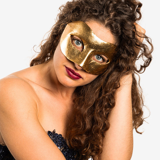 Dorata maschera veneziana in cartapesta realizzata a mano a Venezia dai maestri artigiani.