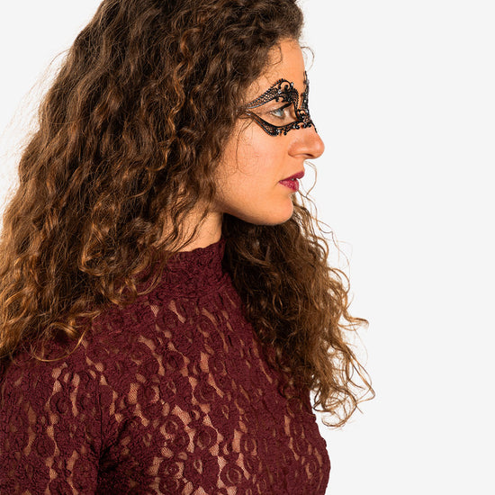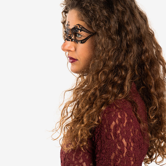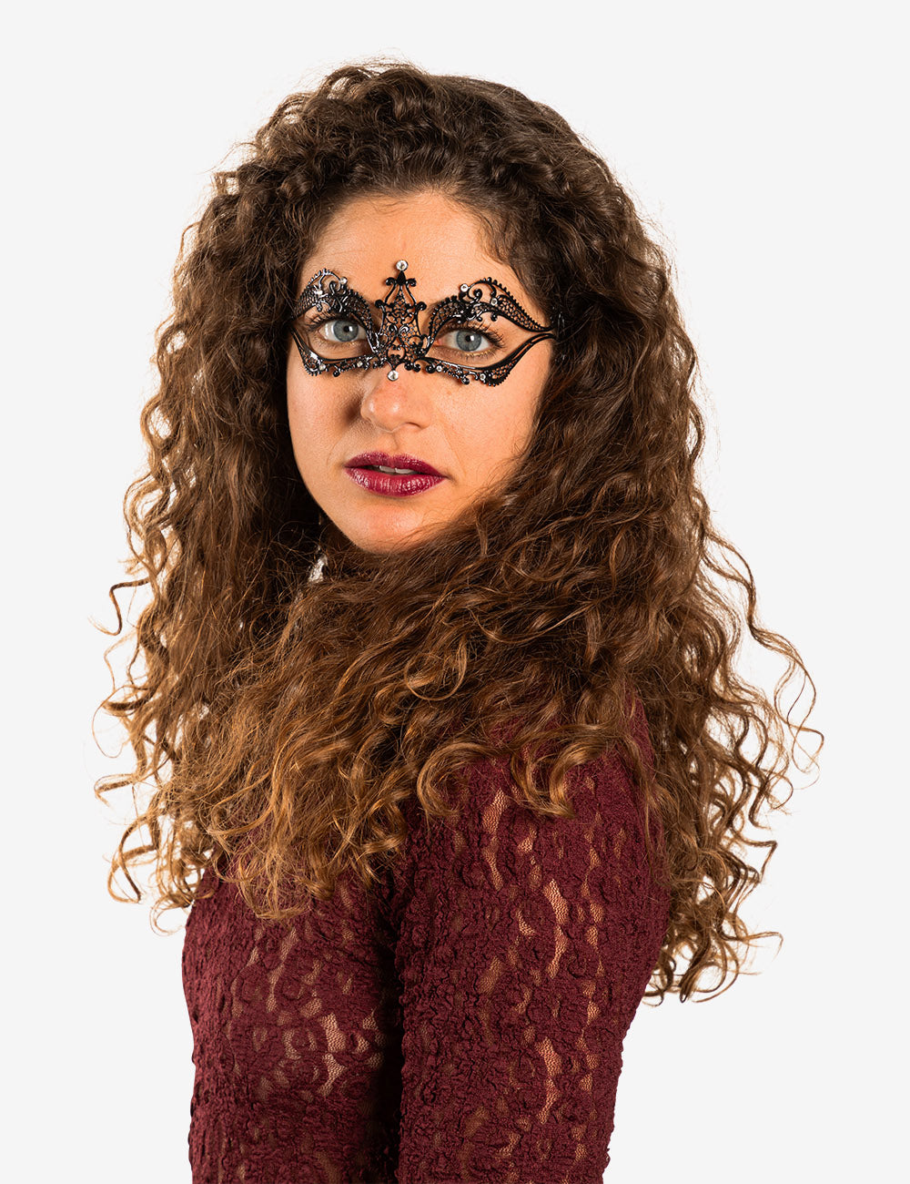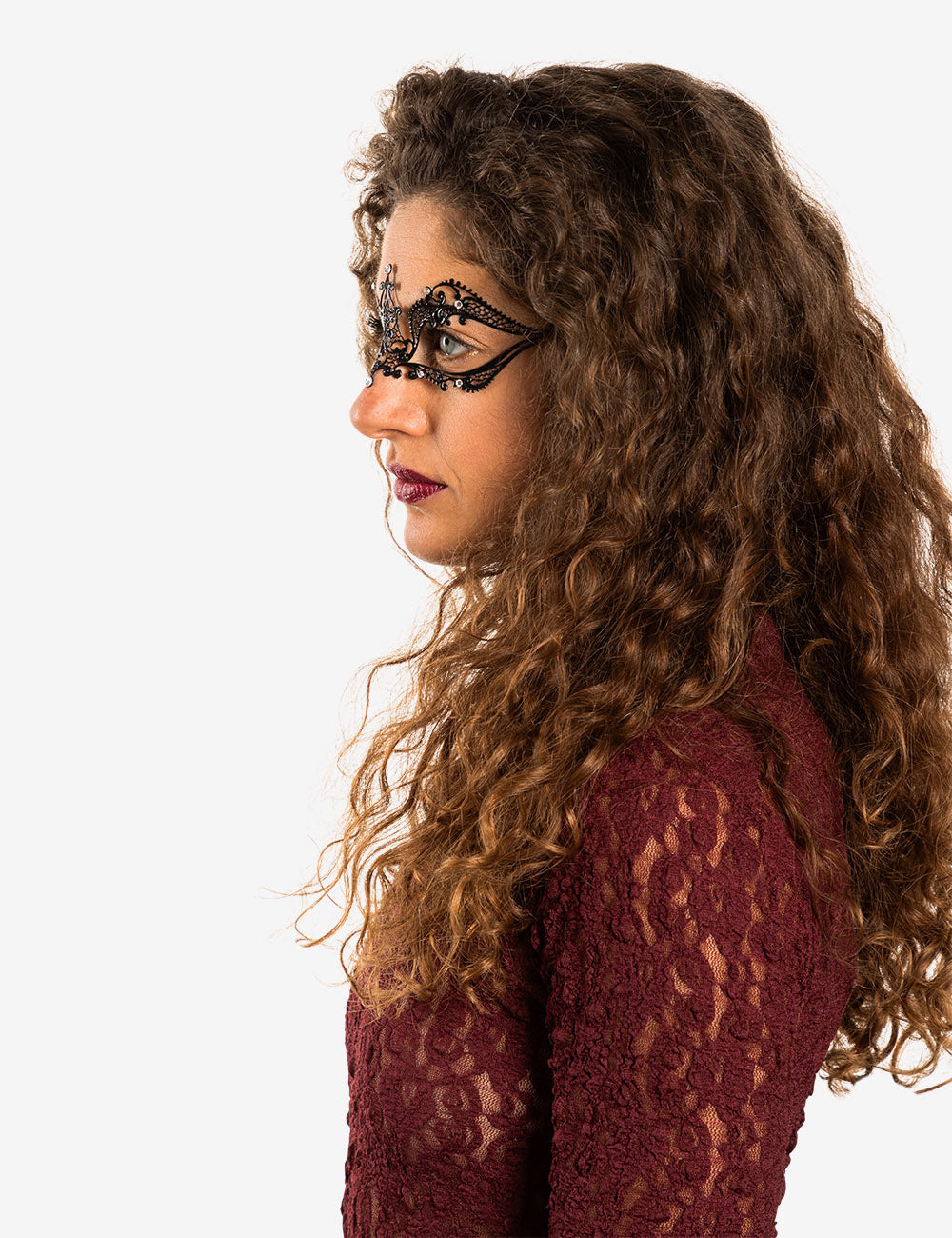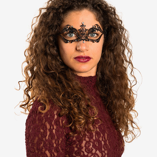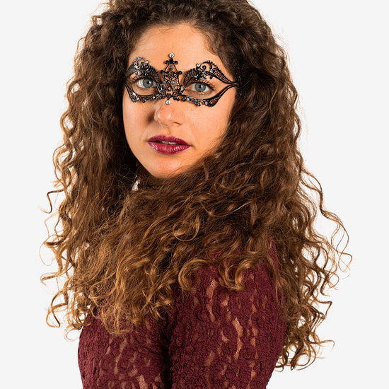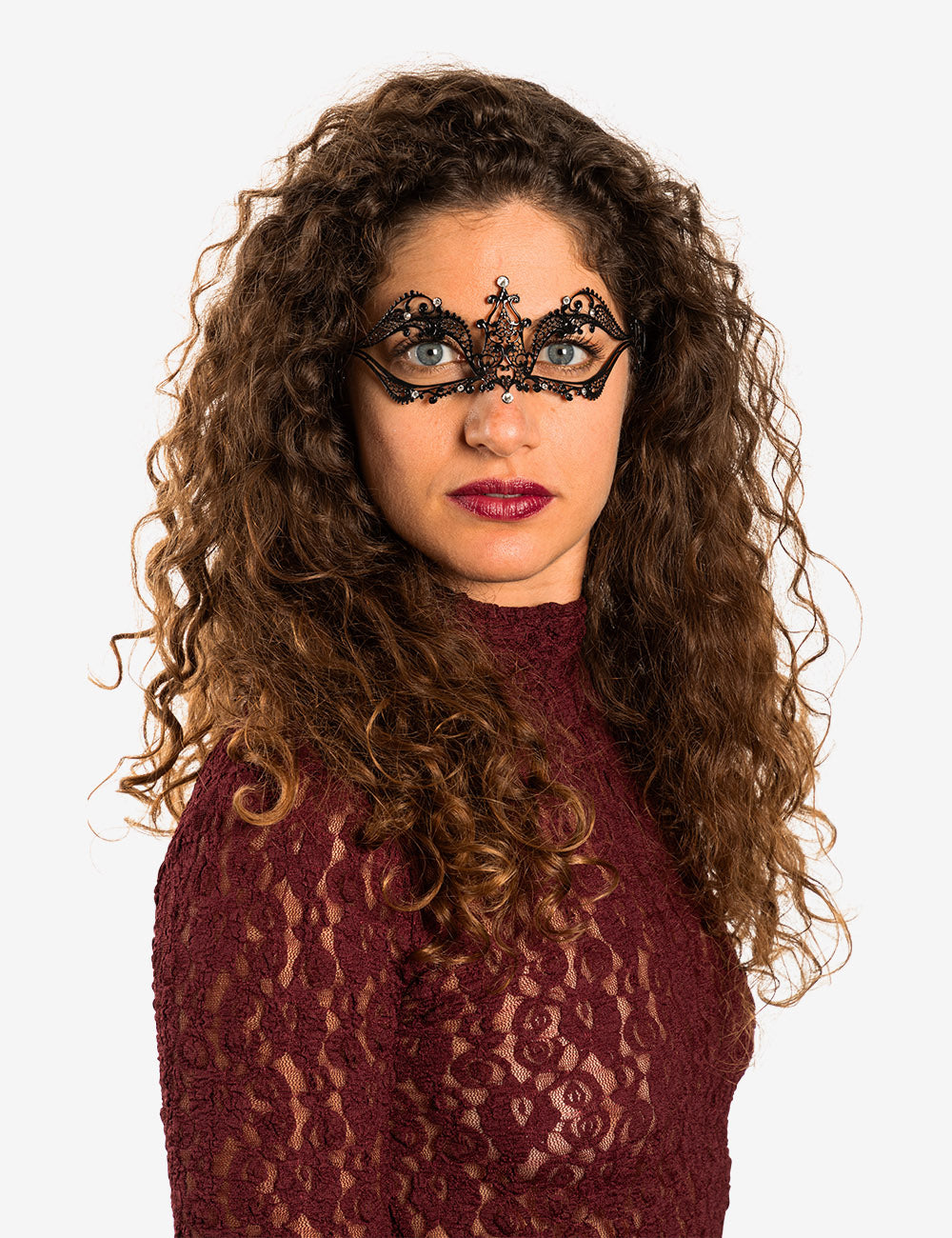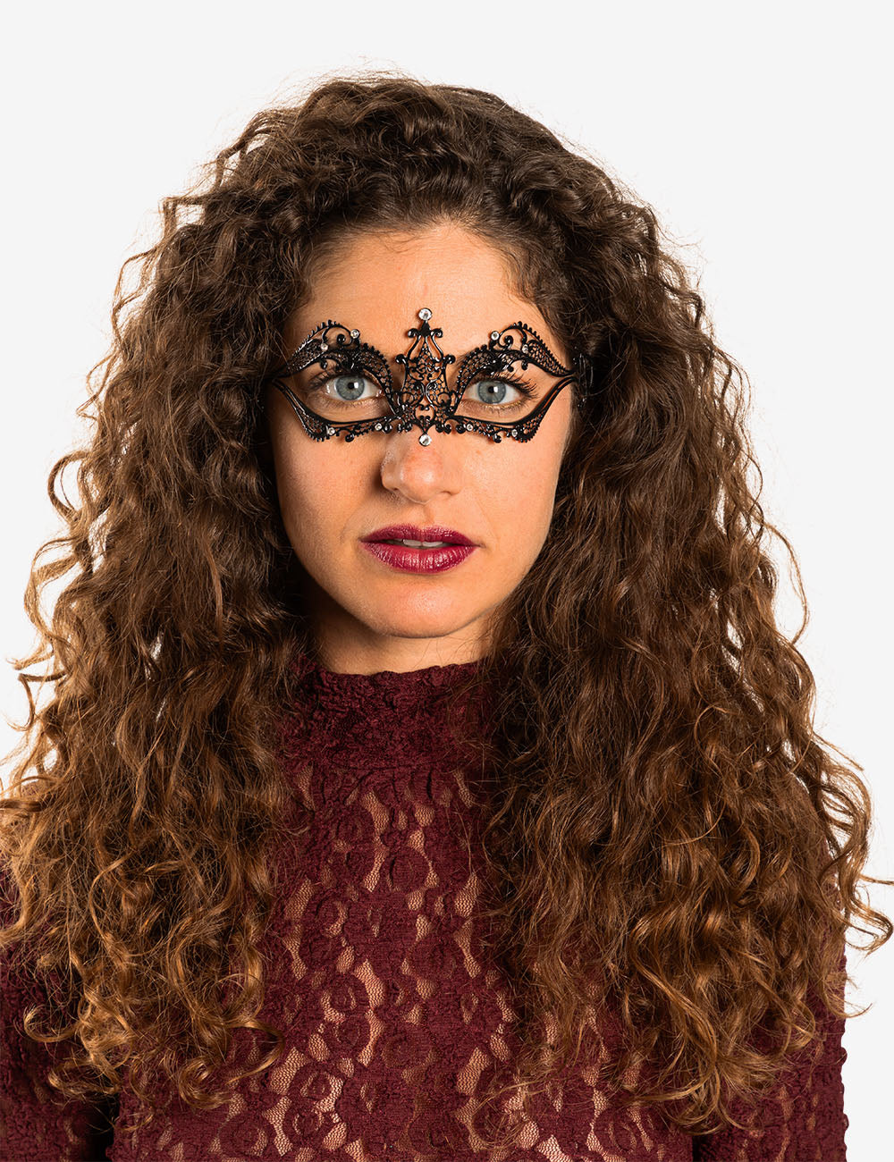 Essentia maschera veneziana con la più fine filigrana metallica, intagliata nel ferro e nell'ottonee dipinta con smalto nero resistente all'acqua e confortevole al contatto con la pelle. La maschera è infine impreziosita con cristalli certificati di alta qualità e rifinita lateralmente con lacci di raso per essere indossata.