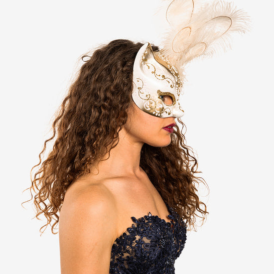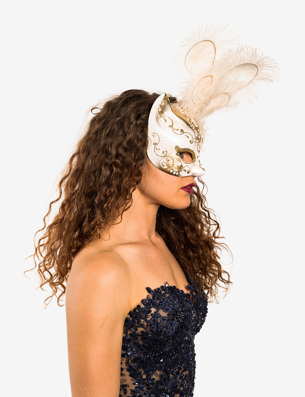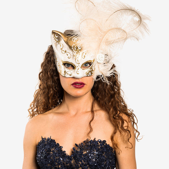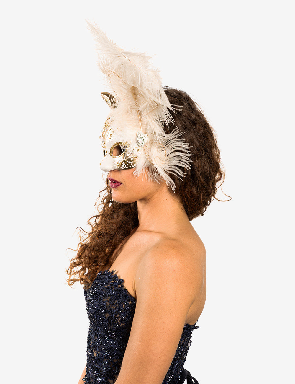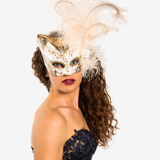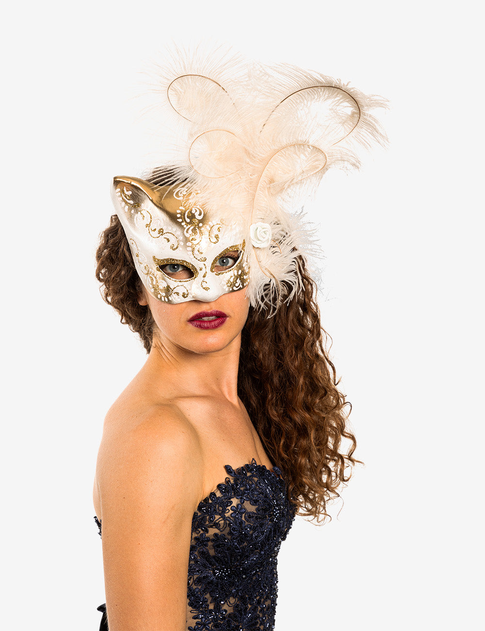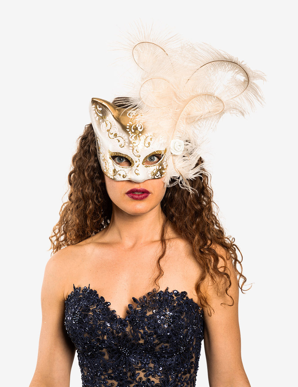 Gatta con Piume maschera veneziana in cartapesta realizzata a mano a Venezia dai maestri artigiani.