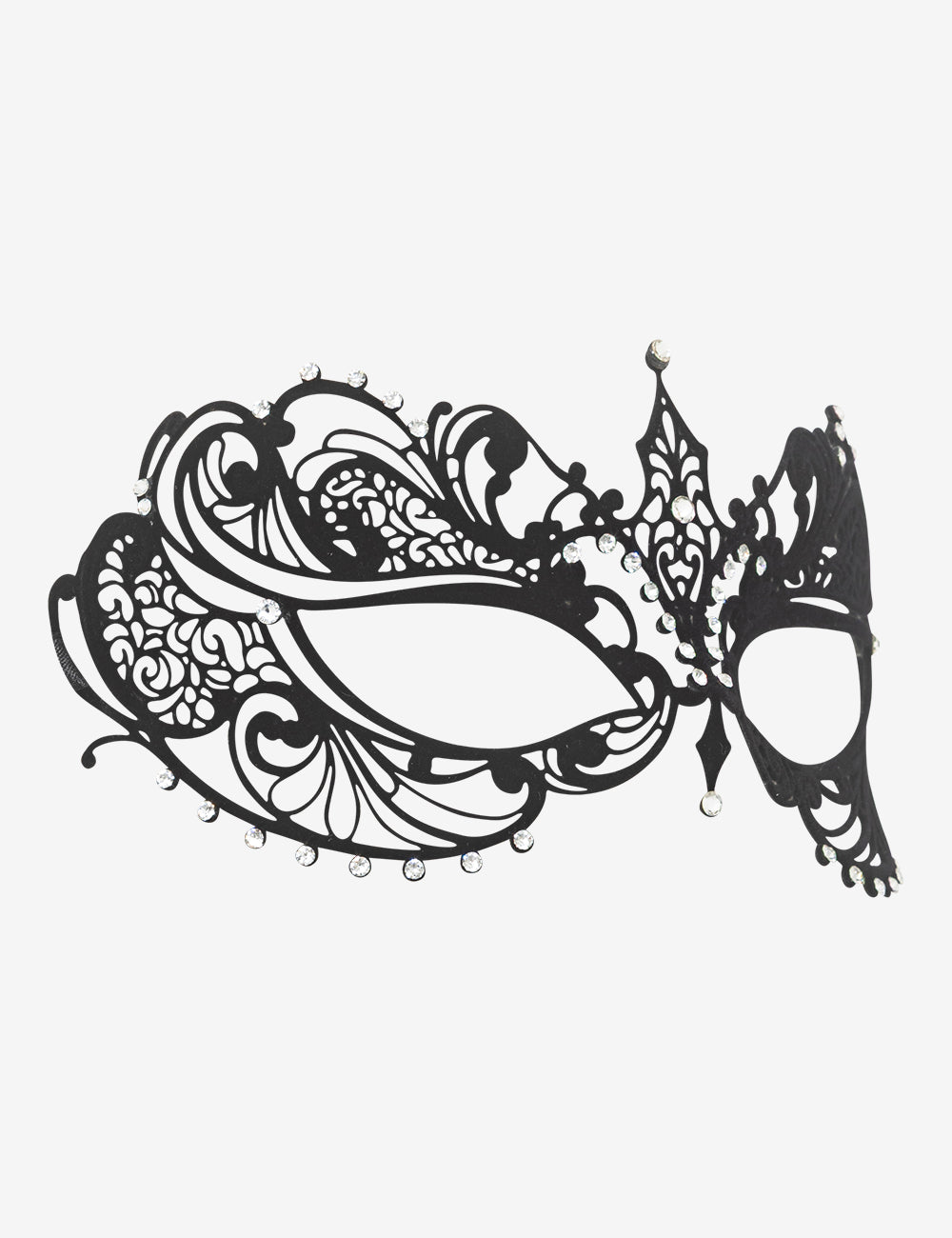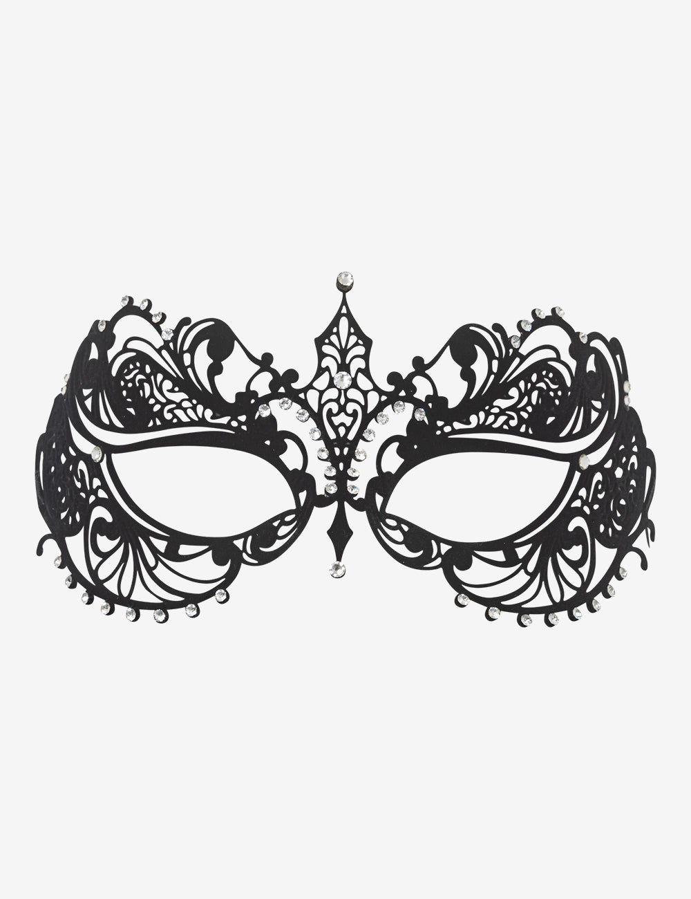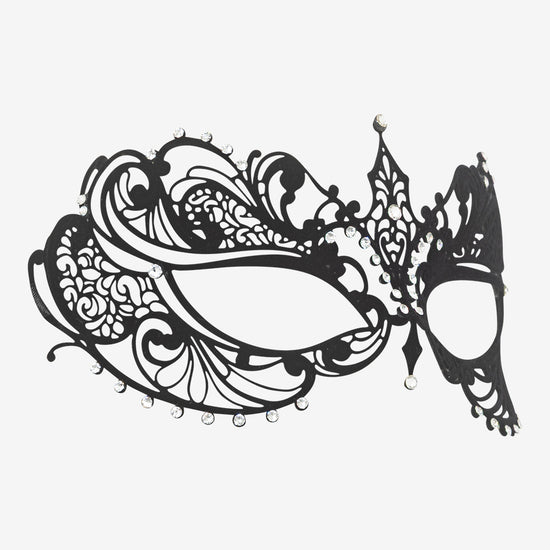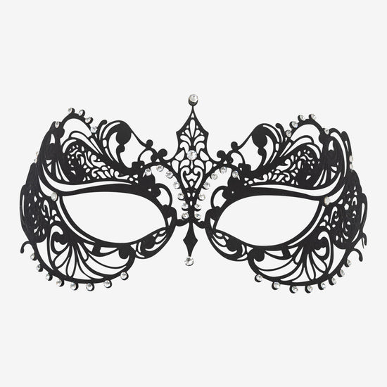 Ginevra Velluto: maschera veneziana con la più fine filigrana metallica, intagliata nel ferro e nell'ottonee dipinta con smalto nero resistente all'acqua e confortevole al contatto con la pelle. La maschera è infine ricoperta di pregiato velluto, impreziosita con cristalli certificati di alta qualità e rifinita lateralmente con lacci di raso per essere indossata.