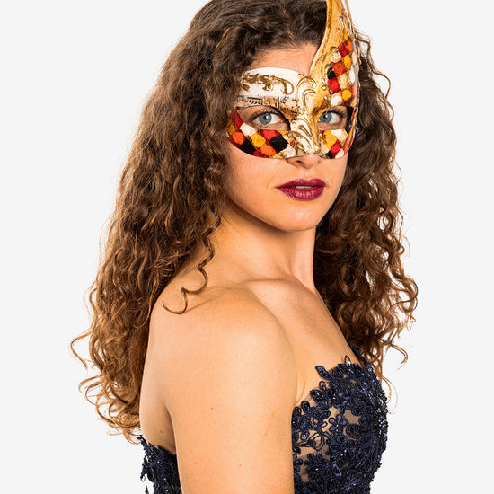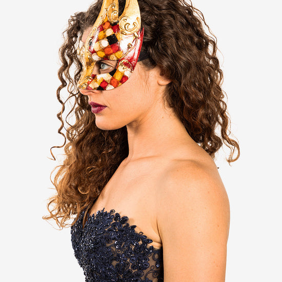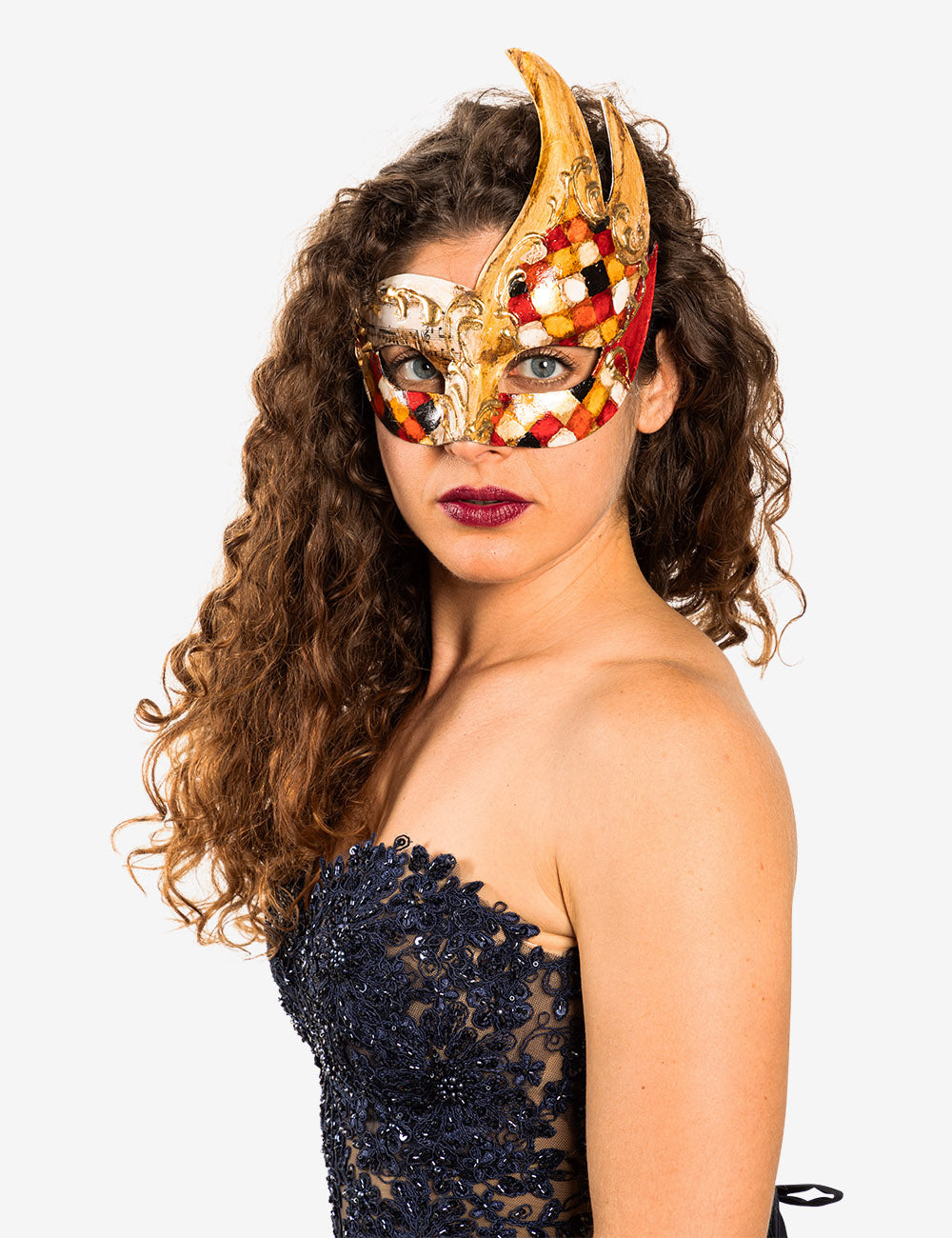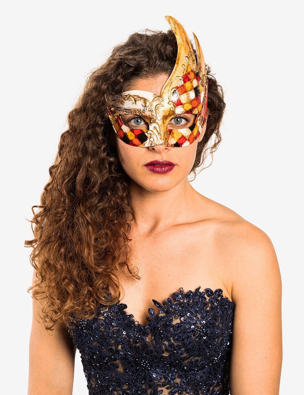 Kaleidos maschera veneziana in cartapesta con decori in metallo realizzata a mano a venezia dai maestri artigiani.