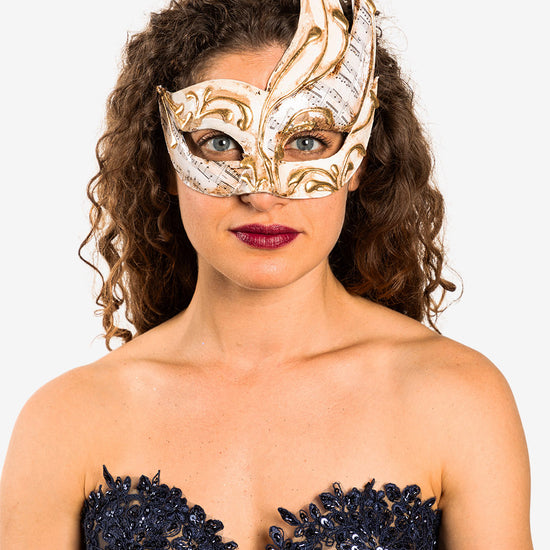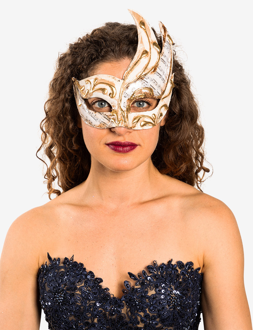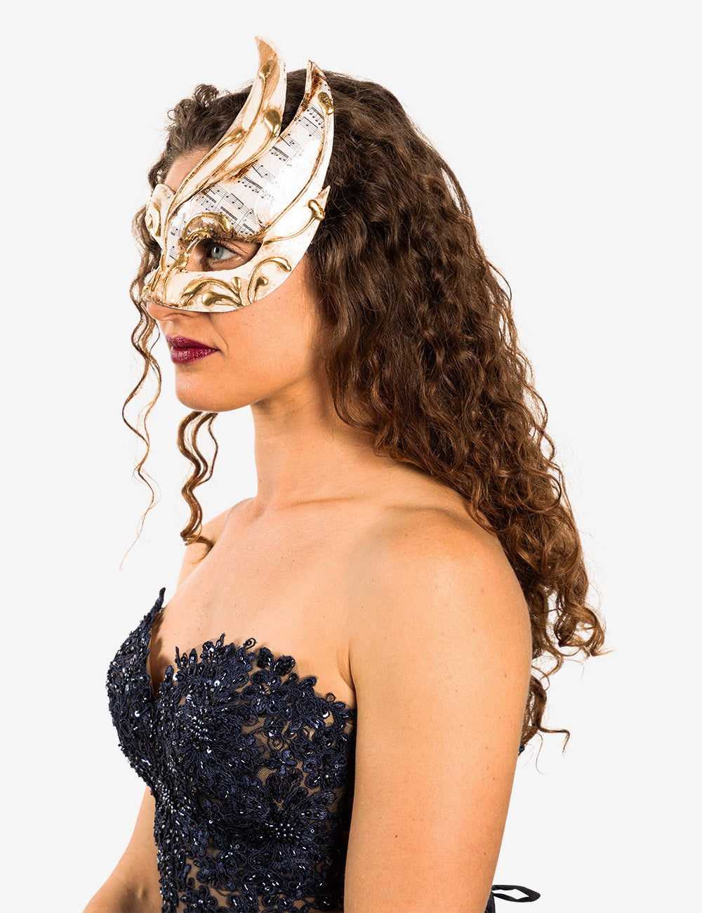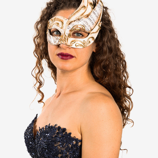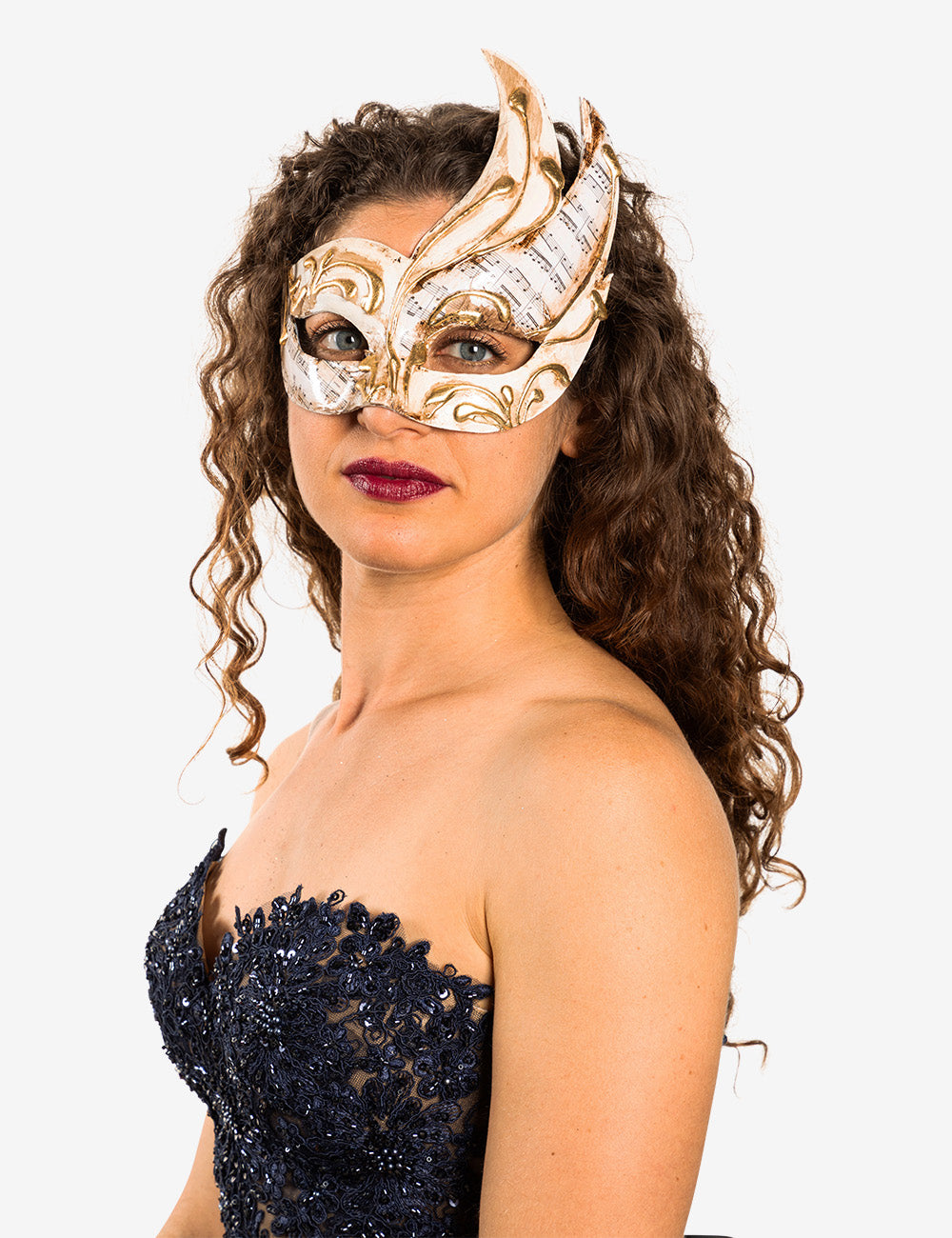 Musica maschera veneziana in cartapesta con decori in metallo realizzata a mano a venezia dai maestri artigiani.