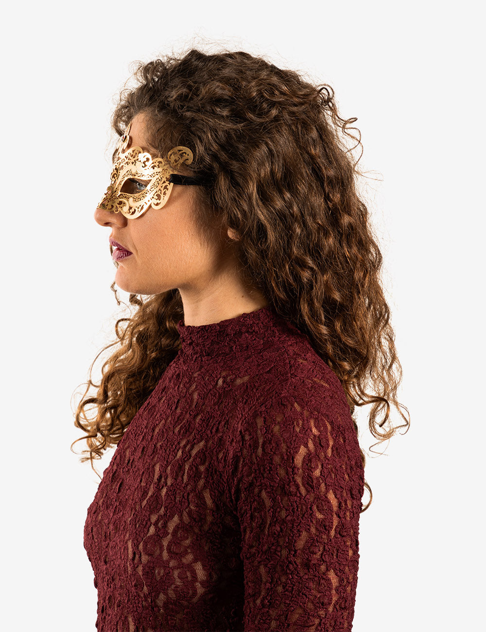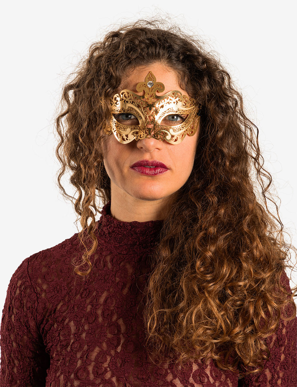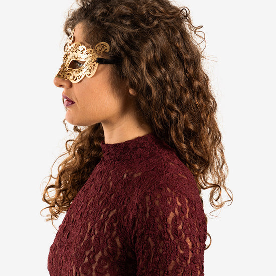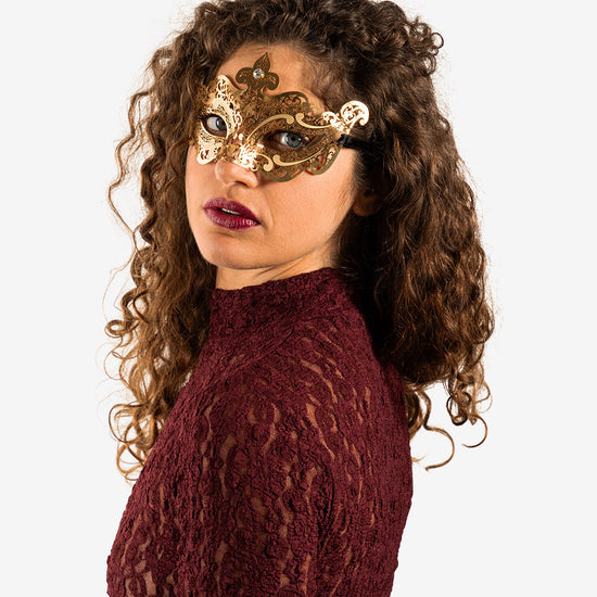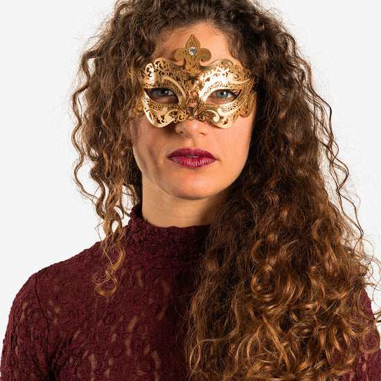 Pigalle Oro con Strass maschera veneziana con la più fine filigrana metallica, intagliata nel ferro e nell'ottonee dipinta con smalto resistente all'acqua e confortevole al contatto con la pelle. La maschera è infine impreziosita con cristalli certificati di alta qualità e rifinita lateralmente con lacci di raso per essere indossata.